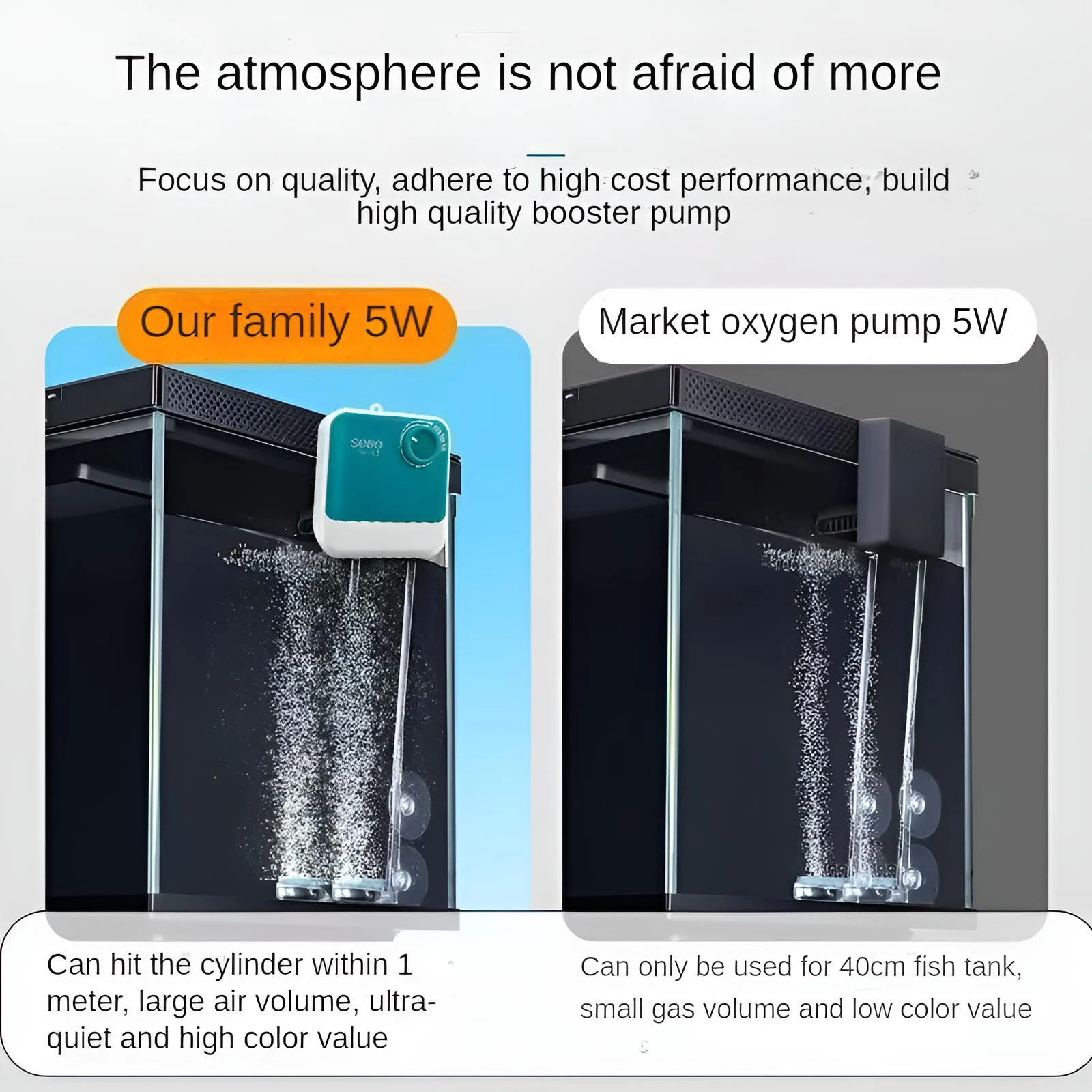 “Not Afraid of Depth or Demand!” Our pumps combine high airflow, deep-water performance, and elegant design – outperforming standard 5W market pumps in both power and aesthetics.