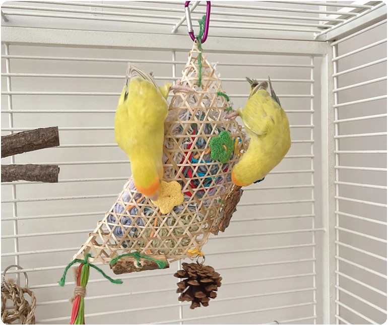 SAFE CHEWING: The bird foraging toys have a bamboo frame with colored edible shredded paper, natural wood pieces and soft thick cotton rope for the birds to chew. Note: When the shredded paper is consumed, you can cut 2 ties and stuff a new pack of shredded paper.